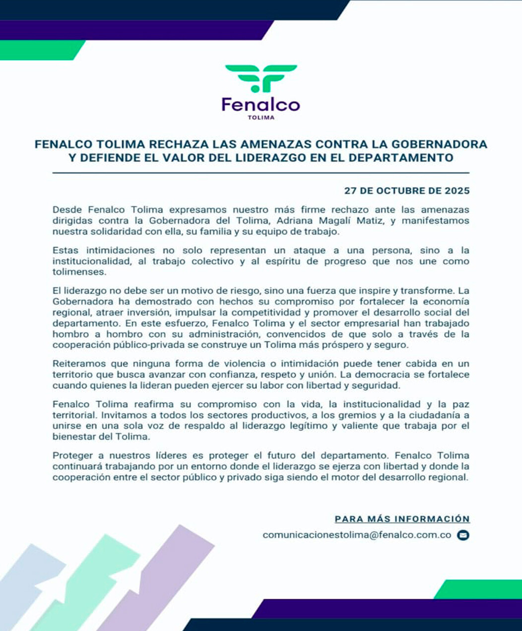 Desde el sector comercial, la Federación Nacional de Comerciantes (Fenalco Tolima) publicó un pronunciamiento en el que calificó las amenazas como un hecho grave que atenta contra el ejercicio del liderazgo público en la región.