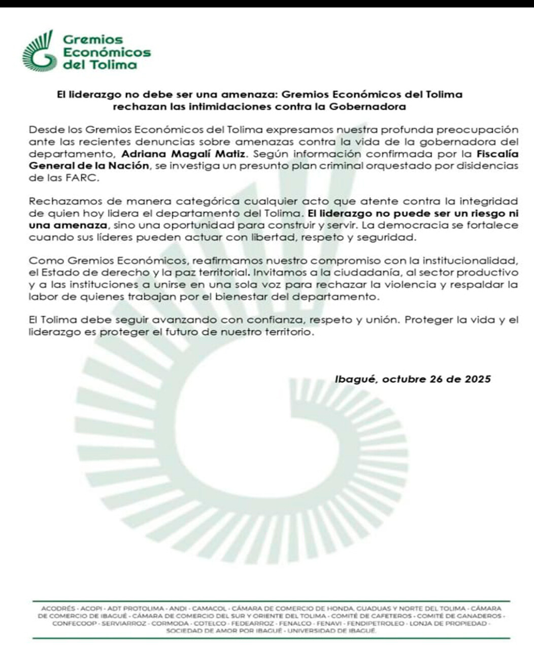 El sector empresarial, académico y gremial del Tolima reaccionó con preocupación tras revelarse en medios nacionales la existencia de un presunto plan criminal para atentar contra la vida de la gobernadora del departamento, Adriana Magali Matiz. Las declaraciones de respaldo y rechazo a las amenazas se conocieron en las últimas horas a través de comunicados y mensajes públicos.