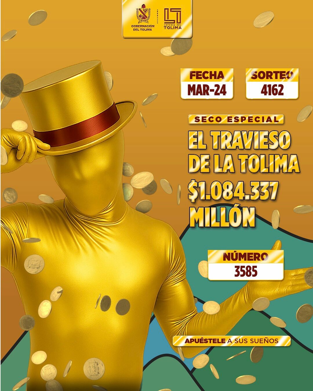 Tras un fin de semana festivo, la suerte no se hizo esperar. El sorteo 4162 de la Lotería del Tolima, celebrado la noche de este martes 24 de marzo de 2026, trajo consigo una lluvia de millones para los apostadores de todo el país. Con su atractivo plan de premios de más de $13.400 millones, la lotería departamental volvió a demostrar por qué es la preferida por los colombianos para cambiar su destino.