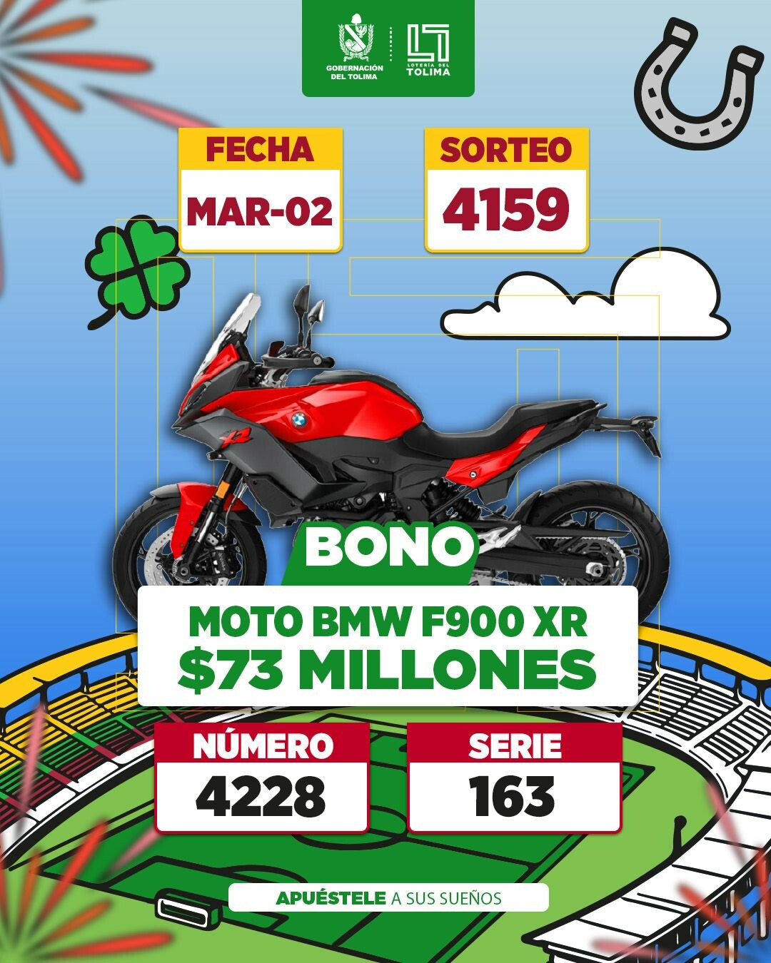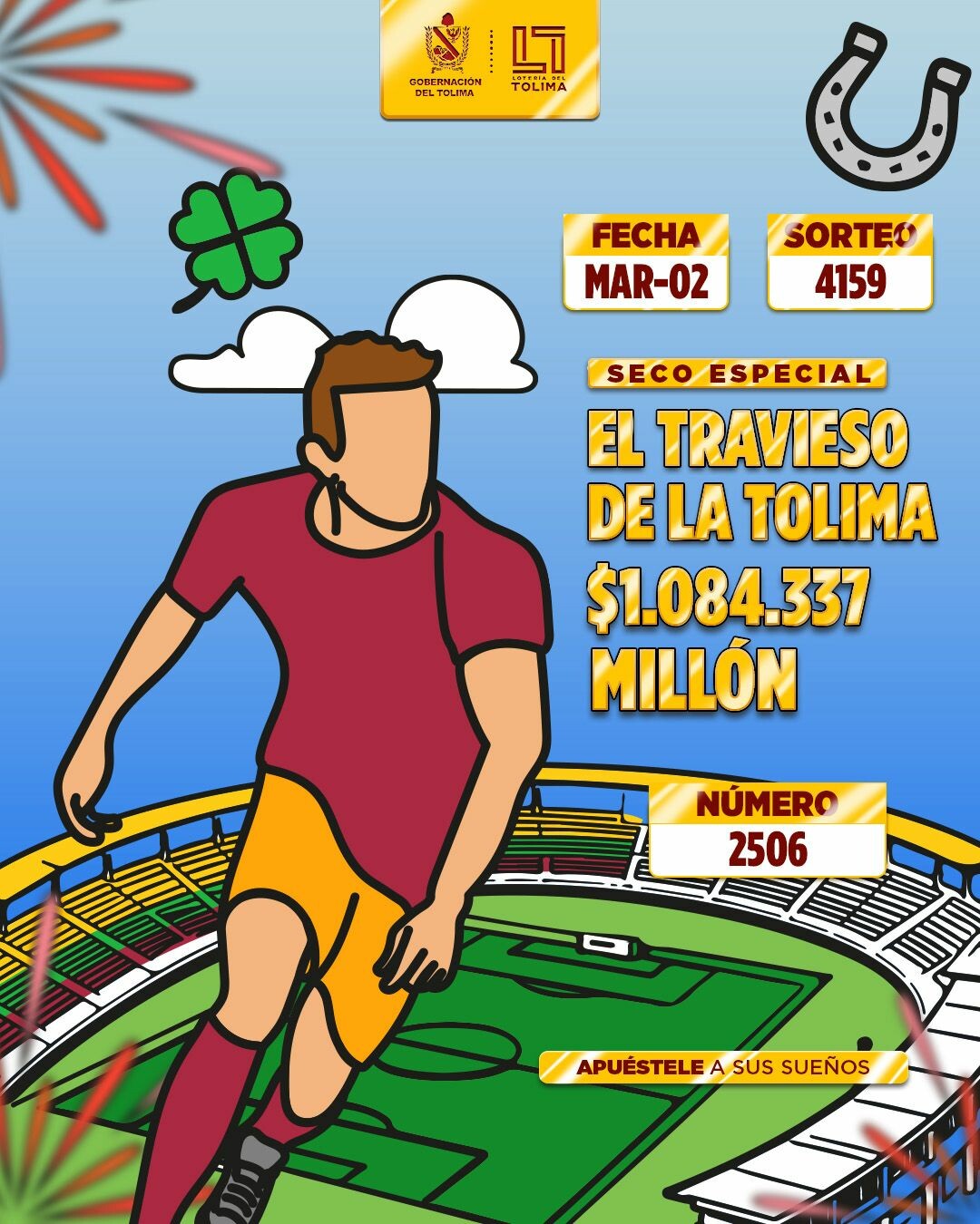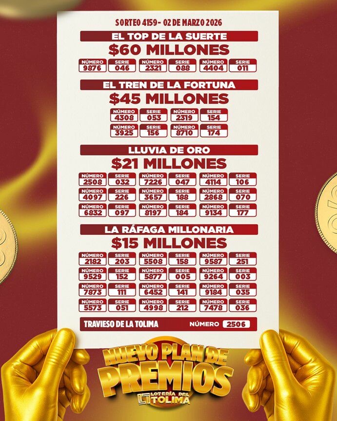 El sorteo 4159 de la Lotería del Tolima, celebrado la noche de este lunes 2 de marzo de 2026, volvió a demostrar por qué es la lotería que más le cumple a los colombianos. En una jornada cargada de expectativa, la bolsa de premios de más de $13.400 millones encontró nuevos dueños, repartiendo alegría en todo el territorio nacional.